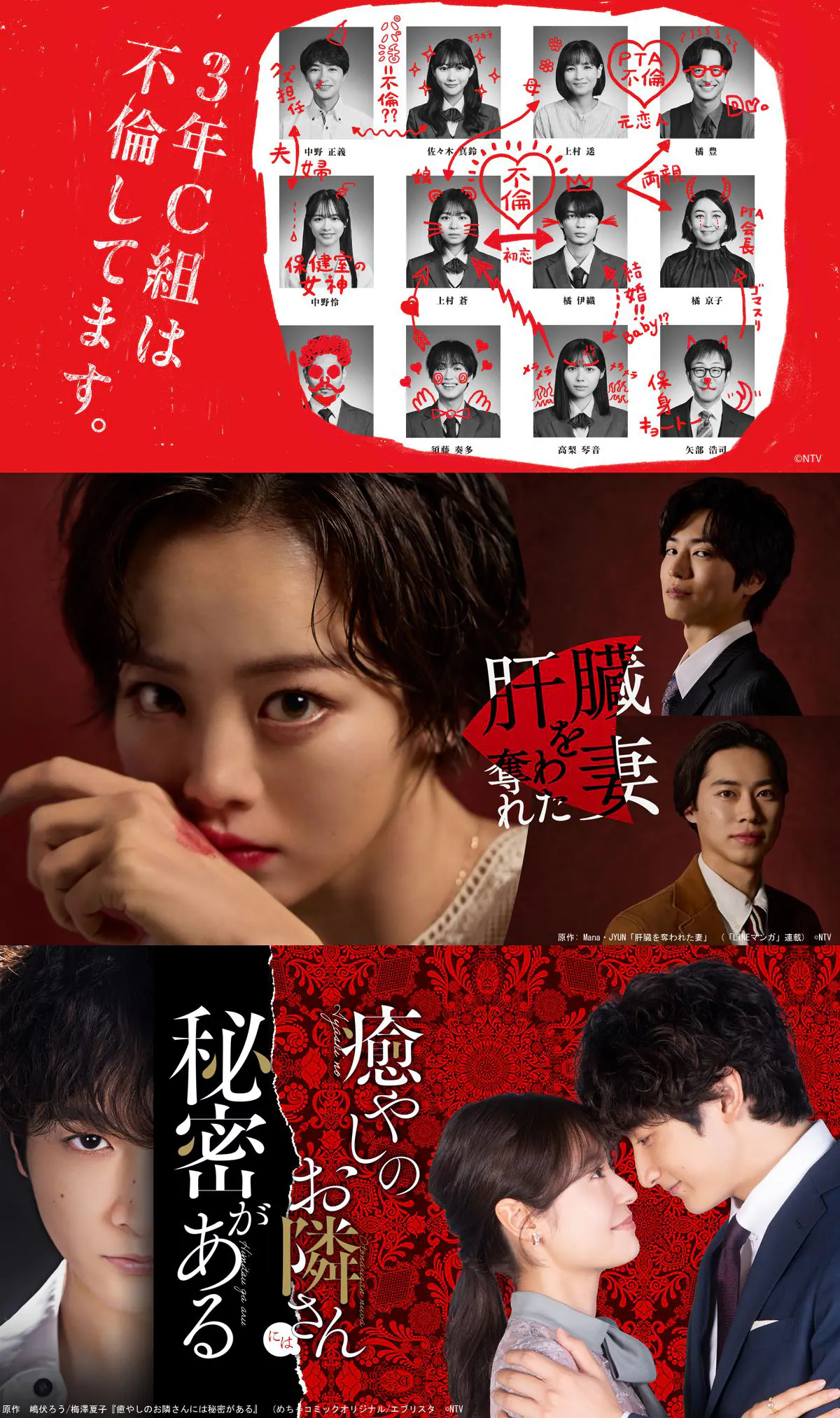 民放公式テレビ配信サービス「TVer」にて、日本テレビの深夜ドラマ枠「ドラマDEEP」で放送された3作品『肝臓を奪われた妻』『癒やしのお隣さんには秘密がある』『3年C組は不倫してます。』の配信が開始された。