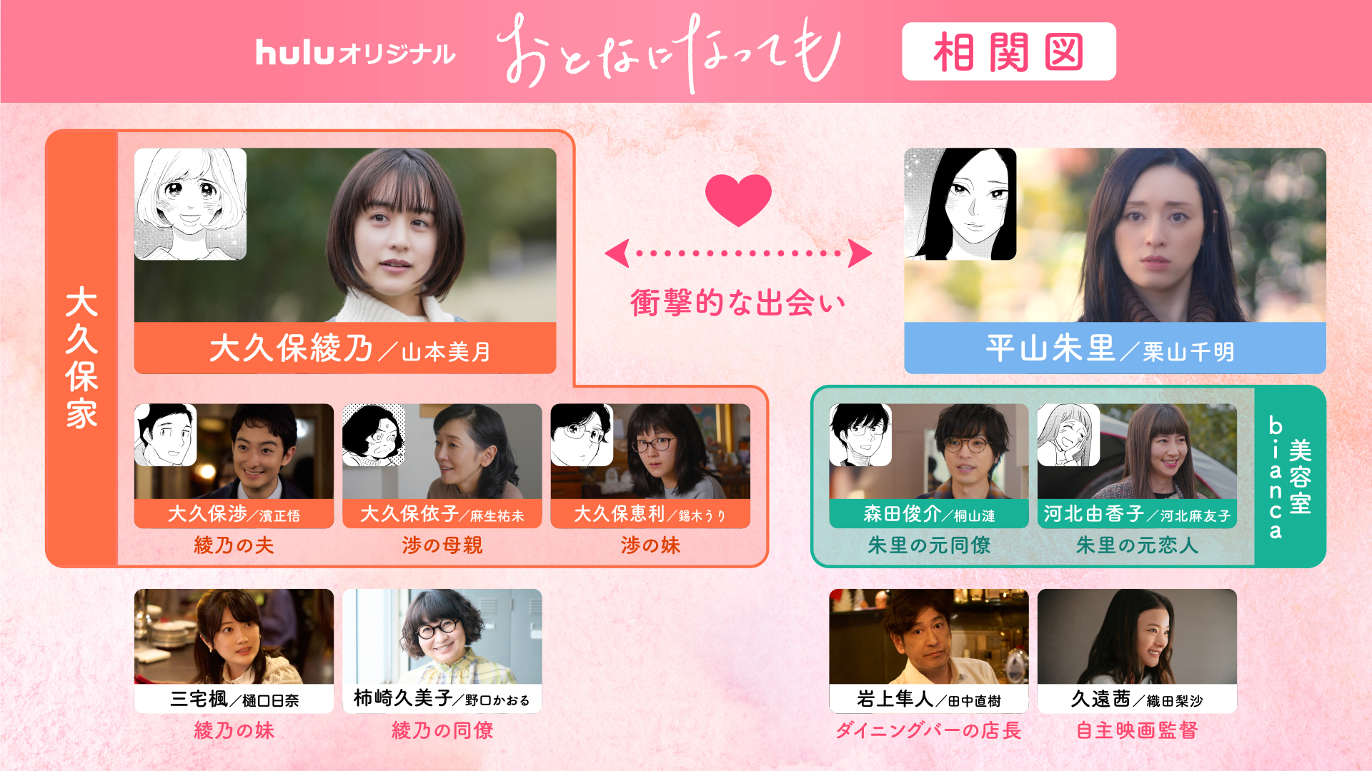 4月26日よりHuluで独占配信される山本美月主演ドラマ『おとなになっても』の第1話・第2話の場面写真と人物相関図が公開された。