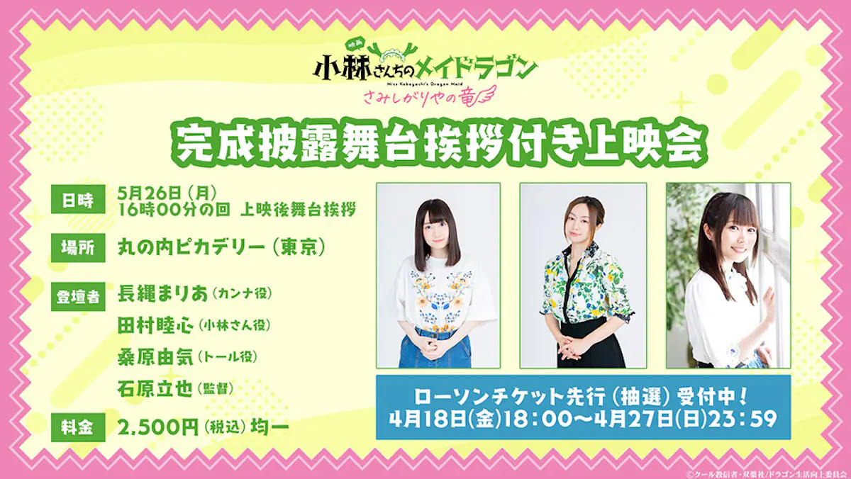 5月26日に丸の内ピカデリーで開催される完成披露舞台挨拶付き上映会には、カンナ役の長縄まりあ、小林さん役の田村睦心、トール役の桑原由気、監督の石原が登壇。メインキャストと監督の制作時やアフレコなどのトークが展開される予定だ。ローソンチケットでの先行抽選受付は4月18日18時よりスタートする。