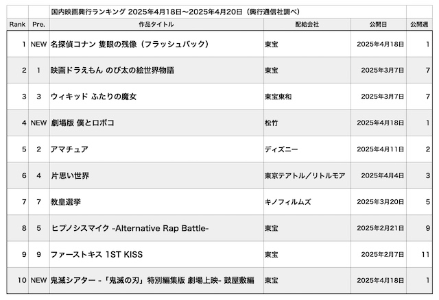 とはいえ、いつまでも他の作品が「逃げる」わけにはいかず、今週末には実写外国映画では『マインクラフト/ザ・ムービー』、実写日本映画では『#真相をお話しします』と、公開初週に『名探偵コナン 隻眼の残像』から1位を奪取することは100%あり得ないとしても、それなりに健闘しそうな作品が公開される。逆に言うと、その2作品のいずれかが化けない限り、昨年の『名探偵コナン 100万ドルの五稜星』の記録、6週連続1位を超える可能性も十分にありそうだ。