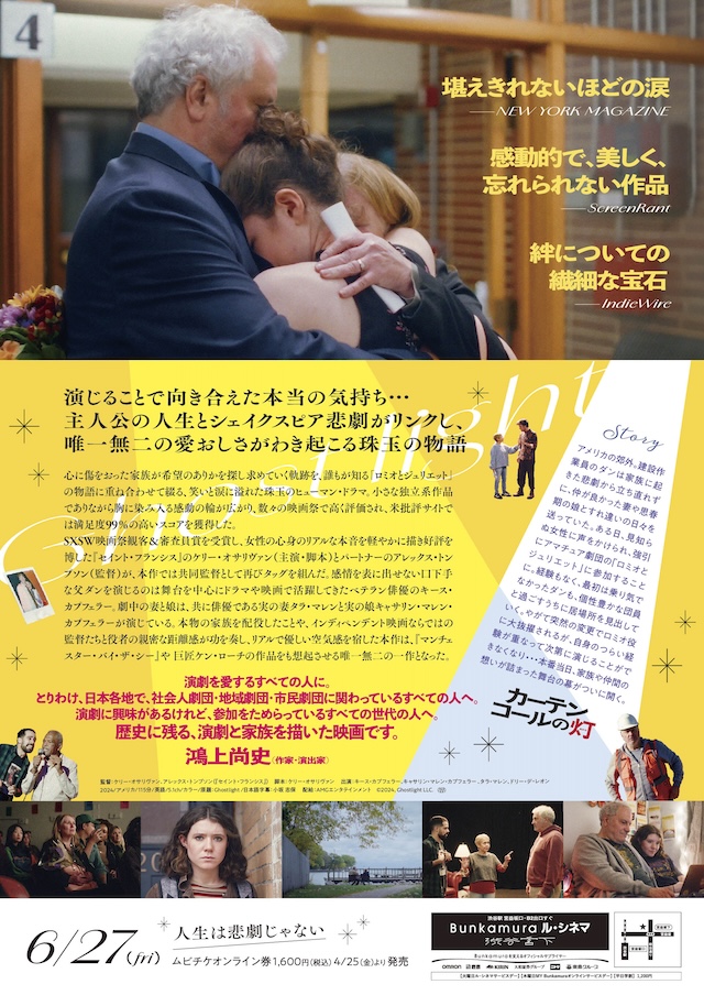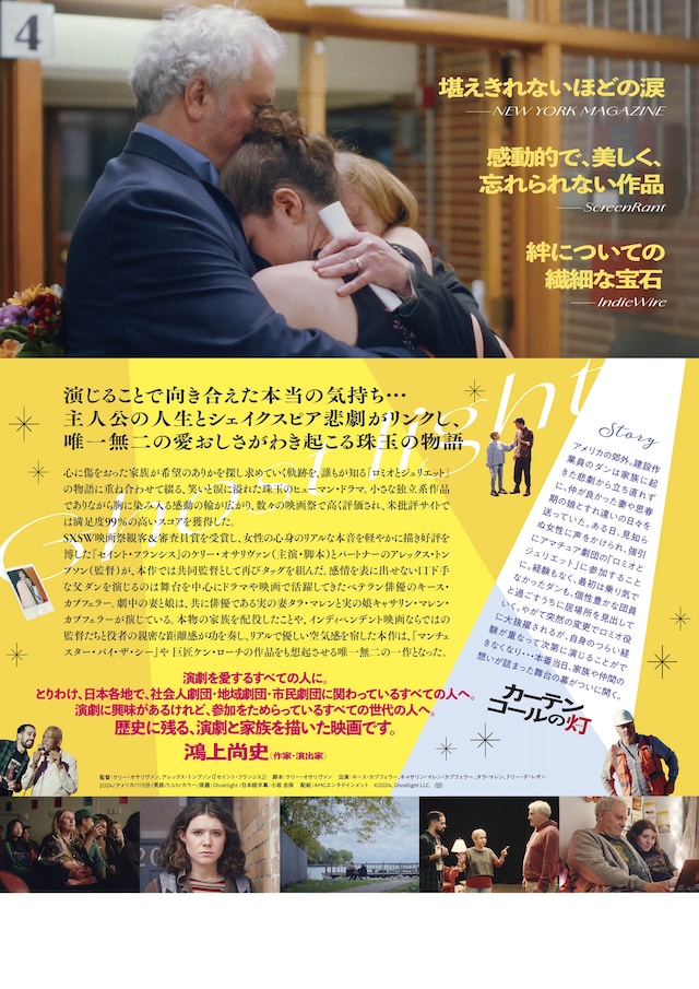 あわせて予告編も公開。アメリカの郊外。建設作業員のダンは家族に起きた悲劇から立ち直れずに、仲が良かった妻や思春期の娘とすれ違いの日々を送っていた。ある日、見知らぬ女性に声をかけられ、強引にアマチュア劇団の『ロミオとジュリエット』に参加することに。経験もなく、最初は乗り気でなかったダンも、個性豊かな団員と過ごすうちに居場所を見出していく。やがて突然の変更でロミオ役に大抜擢されるが、自身のつらい経験が重なって次第に演じることができなくなり……本番当日、家族や仲間の想いが詰まった舞台の幕がついに開く。