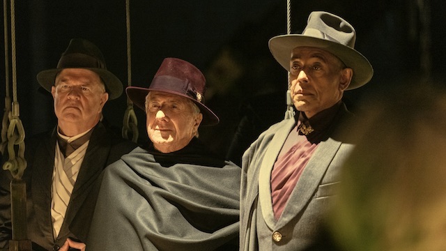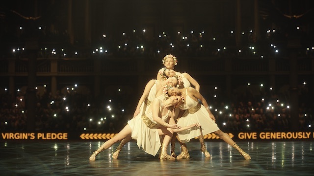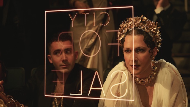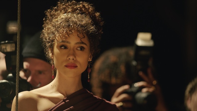 公開されたのは、カエサル(アダム・ドライバー)とジュリア(ナタリー・エマニュエル)が時計台の上から望遠鏡でニューローマを見下ろす場面や、カエサルが高層ビルの屋上で時を止める瞬間、さらにワイヤーに吊るされた鉄骨の上で、キスを交わすロマンティックなシーンなど、物語のスケール感と映像美を感じさせる印象的なシーンを切り取った場面写真。また、クラッスス3世(ジョン・ヴォイト)とワオ(オーブリー・プラザ)の結婚を盛大に祝うパーティーシーンでは、古代ローマのコロッセオを彷彿とさせる豪華なセットやカエサルを陥れようと暗躍するクローディオ(シャイア・ラブーフ)など、個性豊かなキャラクターたちの姿も写し出されている。また、人気歌手ウェスタ・スウィートウォーター(グレース・ヴァンダーウォール)による妖艶なダンスパフォーマンスするカットなど、徹底的に作り込まれた装飾や衣装デザインも注目ポイントとなっている。