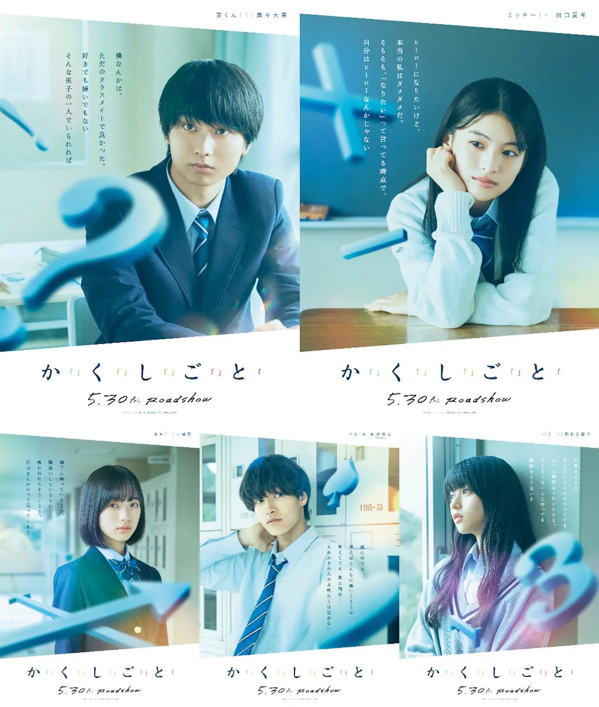 公開されたのは、奥平演じる京、出口演じるミッキー、佐野演じるヅカ、菊池演じるパラ、早瀬演じるエルのキャラクタービジュアル。それぞれのポスターには、各キャラクターの日常の一コマを切り取ったような繊細な表情の写真とともに、いつもは秘めている内なる想いを表した劇中のセリフが添えられている。 京「ただのクラスメイトでよかった」、ミッキー「自分はヒーローなんかじゃない」をはじめとして、各キャラクターの“二面性”が垣間見えるセリフと、それぞれ異なる記号が印象的なビジュアルとなっている。