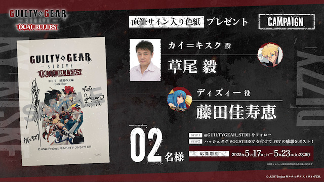 また、#07放送を記念して、カイ=キスク役・草尾毅とディズィー役・藤田佳寿恵さんのサイン入り#07台本が2名様にプレゼントされる。TVアニメ『GUILTY GEAR STRIVE: DUAL RULERS』公式X(旧Twitter)アカウント@GUILTYGEAR_STDRをフォローし、ハッシュタグ #GGSTDR07 をつけて#07の感想をポストすると応募完了となる。応募締め切りは5月23日23時59分まで。