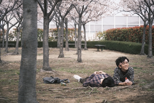 主人公は、萩原利久演じる大学2年生の小西徹。祖母を亡くしたショックから大学を半年近く休んでいた彼だったが、復学した直後から胸ときめかせる出会いをさっそく果たす。授業が終われば勢いよく階段を下り、思いっきり扉を開けてひとり颯爽と退場してゆく桜田花(河合優実)のすがたに心奪われているのだ。映画の前半は、この2人の関係性が思わぬ偶然の連鎖からどんどんと深まってゆく絵空事の極致を巧みな編集で違和感なく見せてゆく。ひょんなことから夜道でばったりと遭遇した2人が駅の目の前で話し合い、「じゃあね」と言って別れ一瞬走行中の電車がインサートされたかと思うと、車内にいる花に場面は切り替わる。そこから徐々にカメラが引いて徹も結局同じ電車に乗ったことが示される場面など、ドキドキする見事な展開だ。しかしいっぽう、徹のバイト先の同僚さっちゃん(伊東蒼)も彼のことを前からずっと気になっている様子で……。