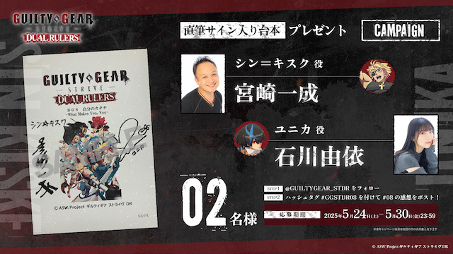 また、シン=キスク役の宮崎一成とユニカ役の石川由依によるサイン入り#08台本が2名様にプレゼントされるキャンペーンの実施も決定。TVアニメ『GUILTY GEAR STRIVE: DUAL RULERS』公式X(旧Twitter)アカウントをフォローし、ハッシュタグ「#GGSTDR08」をつけて第8話の感想をポストすると応募できる。締め切りは5月30日23時59分まで。