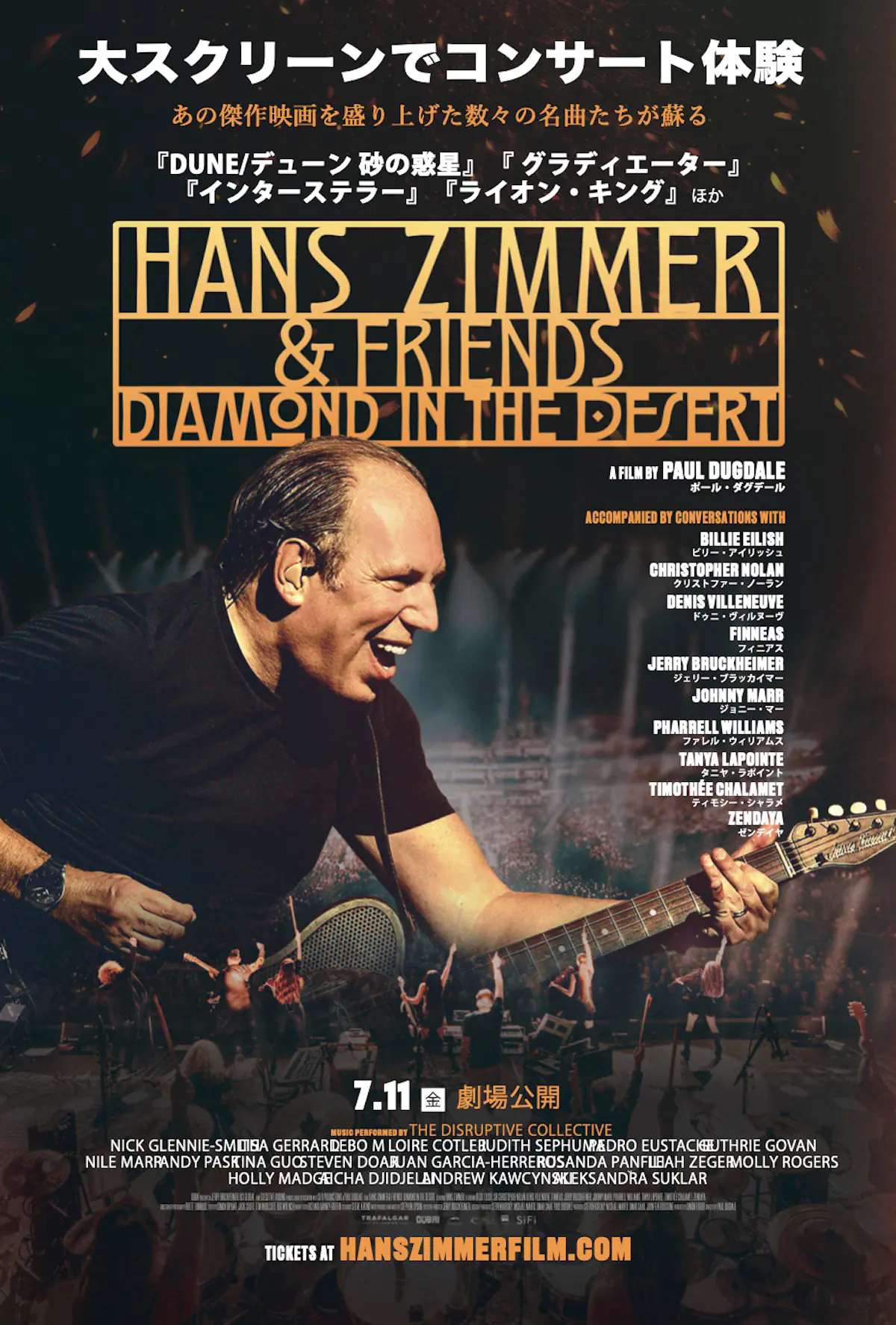ハンス・ジマーのコンサート映画『Hans Zimmer & Friends: Diamond in the Desert(原題)』が、『ハンス・ジマー&フレンズ:ダイアモンド・イン・ザ・デザート』の邦題でTOHOシネマズ 日比谷ほかにて7月11日より1週間限定で劇場公開されることが決定した。