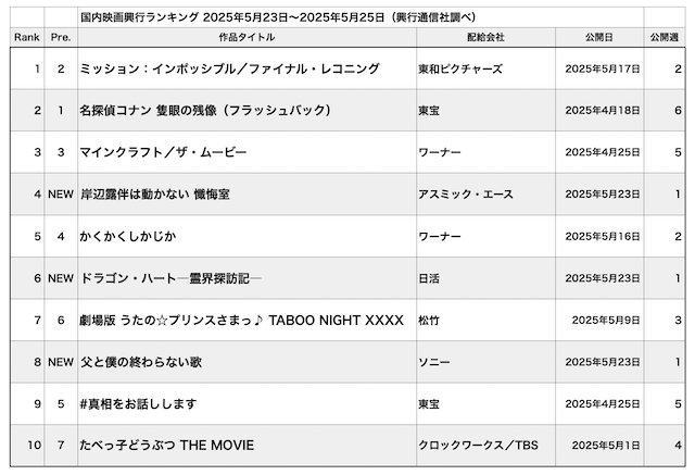 5月第4週の動員ランキングは、5月17日からの先行上映に引き続き、5月23日から本公開がスタートしたトム・クルーズ主演、クリストファー・マッカリー監督の『ミッション:インポッシブル/ファイナル・レコニング』が1位。週末3日間の動員は53万1000人、興収は8億4900万円。先行上映を含む9日間の動員は103万3400人、興収16億2400万円。アニメーション作品を含め今年に入ってから初の外国映画作品のナンバーワンを、文句なしの成績で達成した。