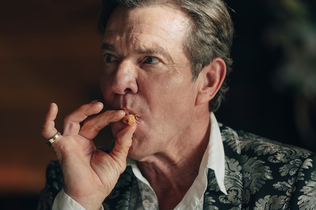 お手洗いに行きたかっただけだったのに、“なぜか”女性用は使えなくなっていて扉を開けることができない。その背後にある男性用トイレに仕方なく入るエリザベスだが、彼女が個室に入った後にやってくるのがデニス・クエイド演じるハーヴェイだ。ハリウッドの大物プロデューサーであり数多くの性暴力・性的虐待によって逮捕されたワインスタインと同じ名前なのが趣深い。彼は電話で話しながら彼女に向けて醜悪な言葉をかけ散らかした後、手も洗わずに去っていく。その後トイレから出てきたエリザベスは、鏡に映る自分を見つめる。その空間そのものが、ハーヴェイが彼女に向けた言葉とアンモニア臭で汚れているのだ。自身に向けられたたくさんの「No」という言葉を手洗いで洗い流すように、気持ちを切り替えようとするエリザベスだったが、次のシーンでは再びハーヴェイのグロテスクな海老の食べ方によって打ちのめされる。