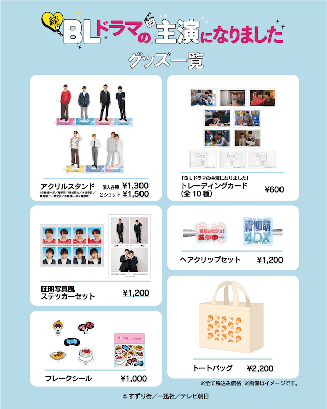 テレアサショップONLINEでは、番組公式グッズも発売中。アクリルスタンドやトートバッグなどに加え、前作『BLドラマの主演になりました』の場面写真を集めたトレーディングカードも登場。また、TELASA公式Xでは、プレゼントキャンペーンもスタート。アカウントをフォロー&リポストすると、抽選で5名に阿部&阿久津のサイン入りメインビジュアルがプレゼントされる。
