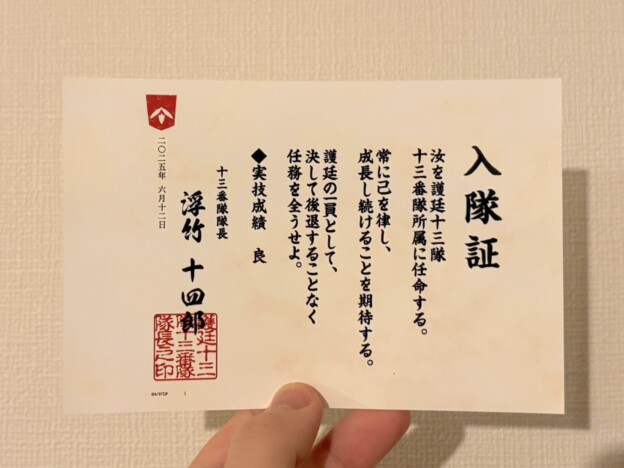 結果、筆者は浮竹十四郎隊長の十三番隊配属となった。正直、自分では意外な結果だったが、診断結果の「優しさと他人を守ることを重視する」という評価に妙に納得してしまった。入隊証も発行されるので、学生時代を『BLEACH』とともに過ごした人にはぜひオススメしたい企画だ。
