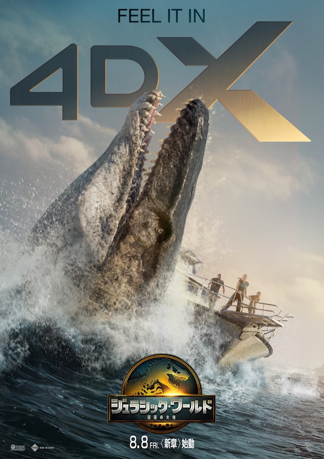 あわせて公開されたラージフォーマット上映限定ポスタービジュアルは、IMAX版と4DX版と SCREENX版の3種類。今にも襲いかかってきそうな躍動感あふれるT-レックス、モササウルス、ケツァルコアトルスがそれぞれ描かれている。