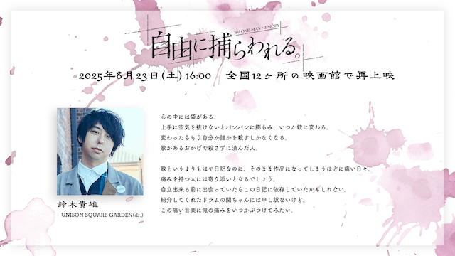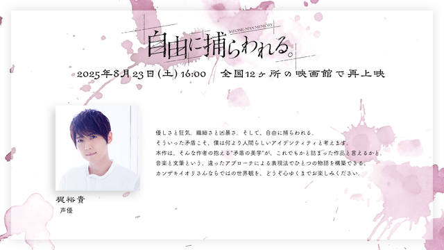 2024年に行われた『カンザキイオリ 3rd One-Man Memory「自由に捕らわれる。」』を全国12館で一斉再上映される。カンザキイオリにとって初となる、自作小説の映像化を試みた本作。2024年に発売された小説第3作目『自由に捕らわれる。』を原作に、同日リリースの3rd EPの楽曲と、自身が歌唱するライブシーンを組み合わせた構成になっている。
