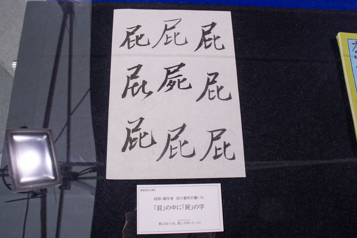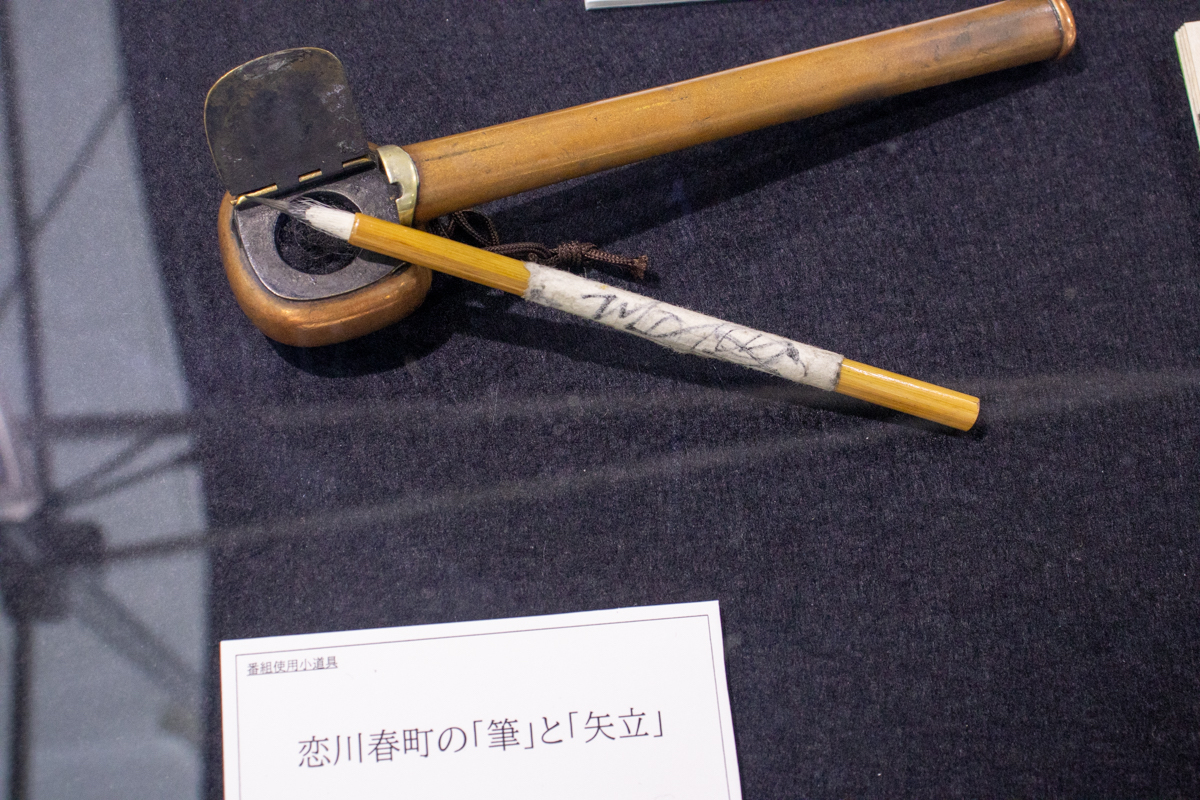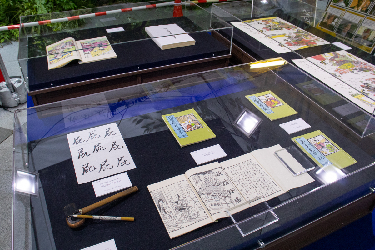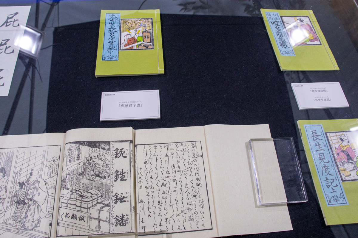 そして展示の中でも特に注目したいのが、実際の撮影で使用された小道具たち。恋川春町(岡山天音)が書いた「屁」の文字の中に囲まれた「屍」の紙や、ドラマの中で春町自身がポキリと折った後、和紙で修復された筆も。黄表紙の『廓𦽳費字盡(さとのばかむらむだじづくし)』や『長生見度記(ながいきみたいき)』なども並べられている。