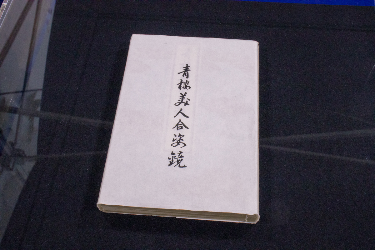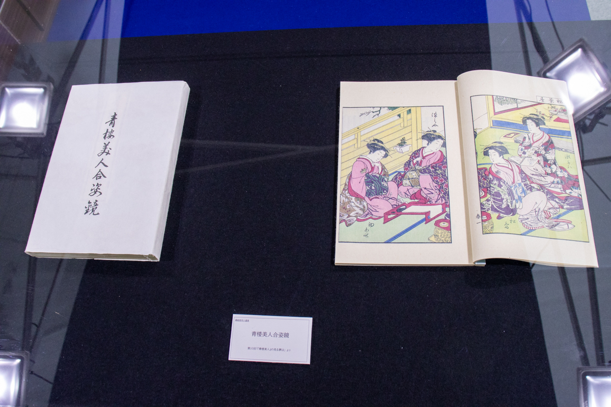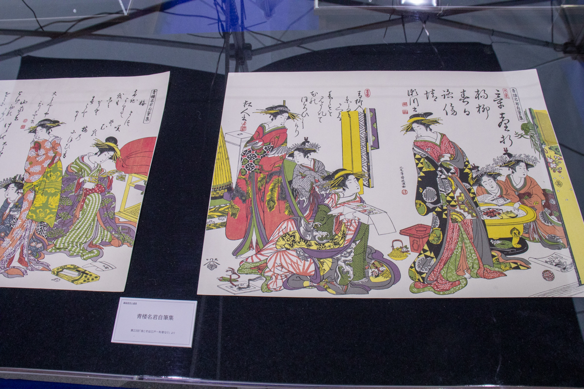 さらに山東京伝(北尾政演/古川雄大)の錦絵『青楼名君自筆集』や、勝川春章(前野朋哉)と北尾重政(橋本淳)の錦絵本『青楼美人合姿鏡』も展示。これらの書物は撮影用に精巧に再現されたもので、江戸時代の出版文化を体感することができる。ちなみに、錦絵は画面上で見るのと実際に目で見るのとでは大違いなので、ぜひこの機会に足を運んでみてほしい。