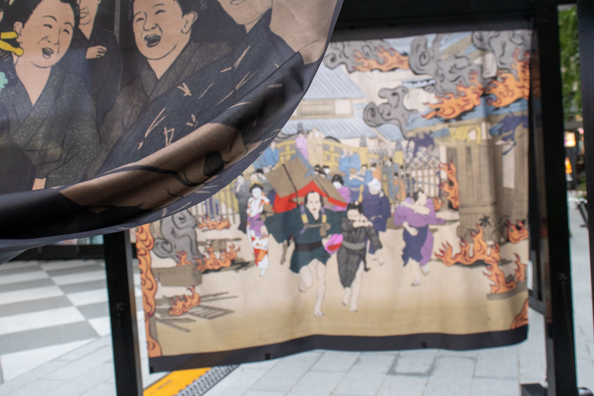 会場に入ってまず目を引くのが「浮世絵イラストインスタレーション」だ。これらはドラマ本編の各話で登場する浮世絵のワンカットをのれんで表現したもので、来場者がくぐり抜けながら進むことで、蔦重の物語を順を追って体験できる構成になっている。