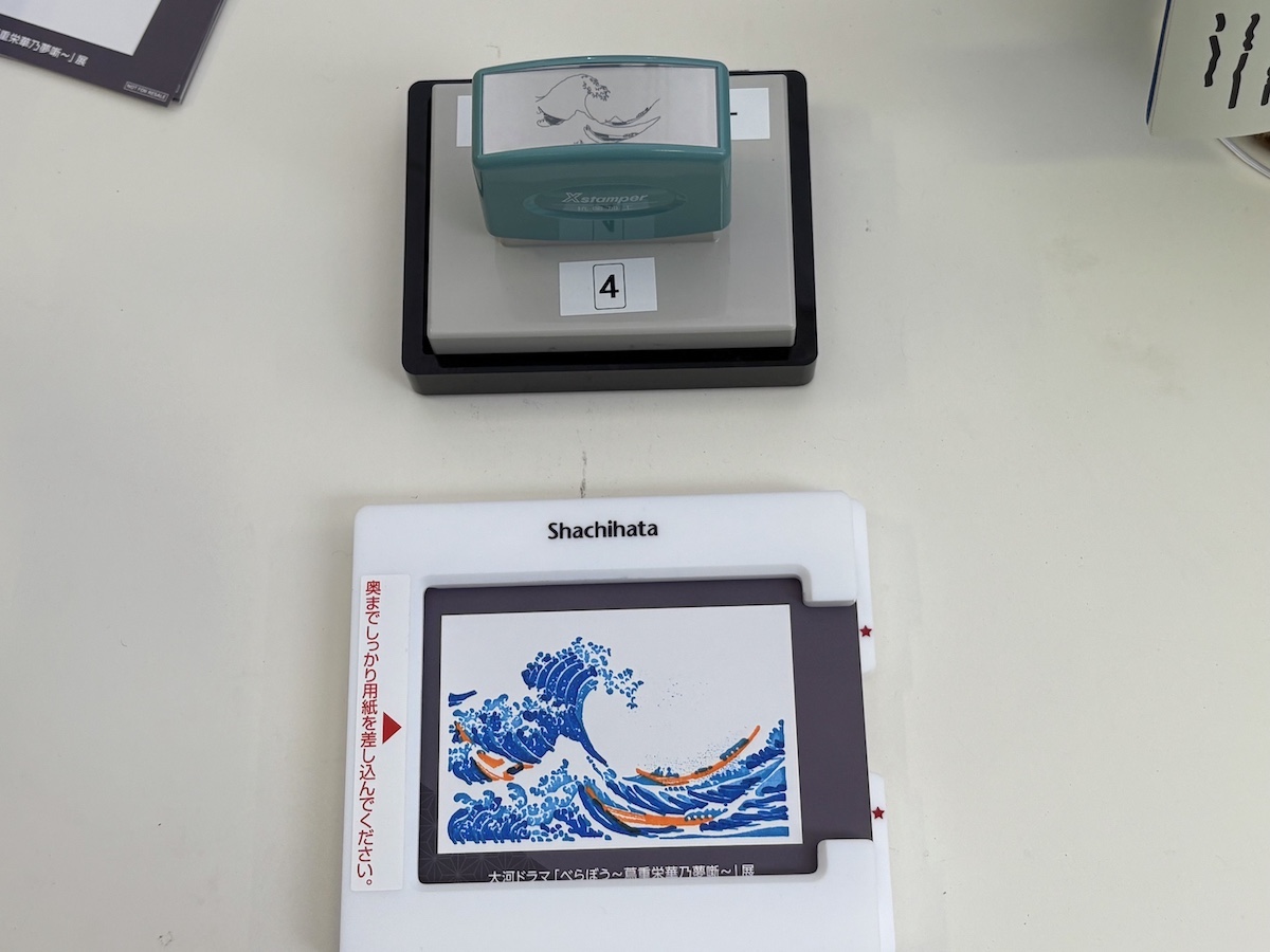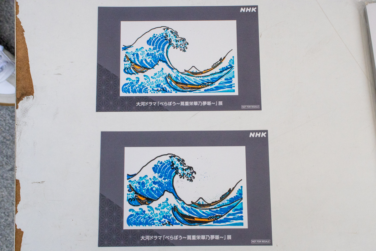 会場では第1話から第25話までの2分ダイジェストを繋げた映像が常時上映されており、約1時間かけてこれまでの物語を振り返ることができる。さらに葛飾北斎の浮世絵『神奈川沖浪裏』を版画のように順番に押して完成させる「浮世絵スタンプ体験」や、展示や『べらぼう』本編について思いを届けるメッセージコーナーも。ここで書いたメッセージは実際に出演者のもとに届けられるそうだ。