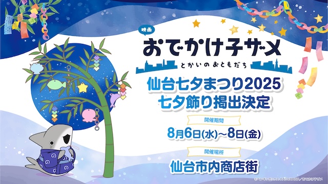また、8月6日より仙台市にて開催される「仙台七夕まつり 2025」の一環として、仙台市内の商店街にて、『映画 おでかけ子ザメ とかいのおともだち』のオリジナル七夕飾りが掲出されることが決定。さらに会場ではペンギンボックス描き下ろしの『ご当地子ザメちゃん』北海道・東北ビジュアル使用グッズも販売に先んじて会場にて先行販売される。北海道・東北ならではの風景や文化とコラボした、かわいい子ザメちゃんの限定イラストが楽しめるアイテムばかりが揃う本イベント。なお、本アイテムは、会場での先行販売以外にも販売を予定しており、今後の販売予定については、後日改めて公式サイトや公式Xにて案内される予定だ。