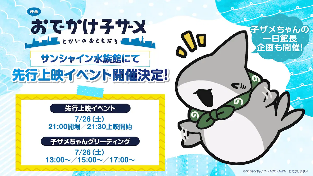 8月22日に公開される『映画 おでかけ子ザメ とかいのおともだち』の先行上映イベントが、サンシャイン水族館にて7月26日に開催されることが決定した。