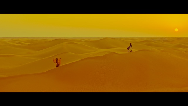 本作が特徴的なのは、この演奏シーンが、ライブがおこなわれたコカ・コーラ・アリーナだけに収まらないところだ。ジマーの音楽と呼応するように、ドバイの自然の風景や街並みが演出として組み込まれるのである。冒頭の『DUNE/デューン 砂の惑星』の楽曲では、まるで映画のロケ地そのものの壮大な砂漠で太鼓が打ち鳴らされる。