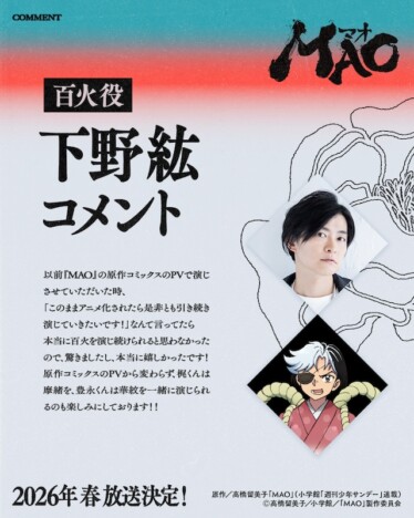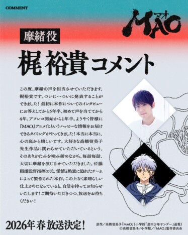 高橋留美子『MAO』NHKで2026年春にTVアニメ化 キャストに梶裕貴×川井田夏海×下野紘ら
