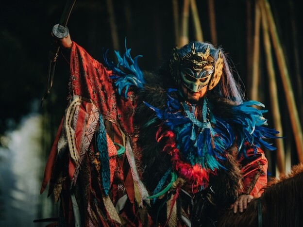 仮面を被った、馬上での静かで異様な佇まい。派手なブルーの衣装に包まれたビジュアルがここまで似合う男はいない。