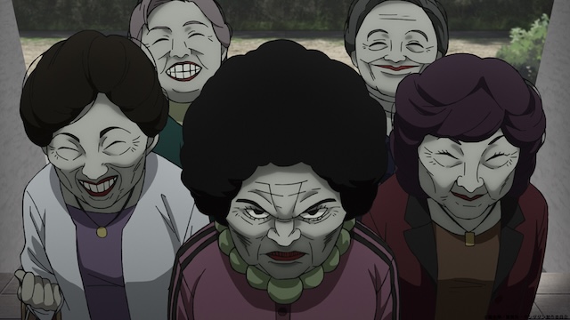 第13話ではモモが温泉に入っている最中、ほぼ全裸の恰好をした一族の男衆が集団で湯船に入ってきて、あわや暴行寸前という事態に。その一方で一族を率いる鬼頭ナキは、ジジの家で勝手に井戸端会議を開き、脅迫まがいの言動を行うのだった。