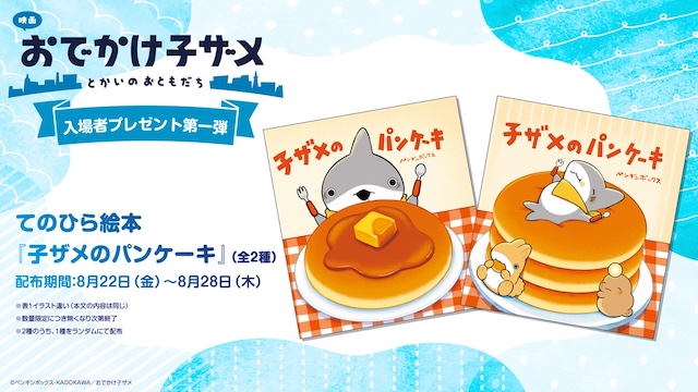 また、入場者プレゼント第1弾として、原作のペンギンボックスによる描き下ろしのてのひら絵本『子ザメのパンケーキ』(表紙ランダム2種)が決定。絵本『子ザメのパンケーキ』は、子ザメちゃんと映画に登場するあんこうちゃん、うさめちゃんたちがパンケーキを頬張っている姿が描かれた表紙となっている。