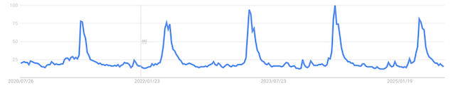 次に、キーワードの検索回数の推移が分かる「Googleトレンド」を使ってチェックしてみよう。下記は、過去5年間で『鬼滅の刃』というワードがどれだけ検索されたかを表したグラフだ。最も検索された時点を100として、人気度を数値で比較表示してくれる。