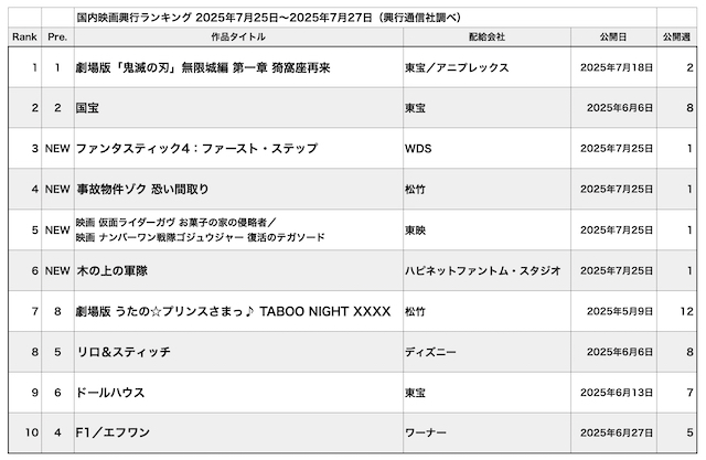2位は前週と同じく『国宝』。3位以下には『ファンタスティック4:ファースト・ステップ』、『事故物件ゾク 恐い間取り』、『映画 仮面ライダーガヴ お菓子の家の侵略者/映画 ナンバーワン戦隊ゴジュウジャー 復活のテガソード』と、『劇場版「鬼滅の刃」無限城編 第一章 猗窩座再来』の公開日から1週遅れつつも、今年の夏休み興行を当てこんだ国内外の初登場作品が並んだ。
