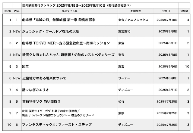 8月第2週の動員ランキングは、前週までのトップ3作品『劇場版「鬼滅の刃」無限城編 第一章 猗窩座再来』と劇場版『TOKYO MER〜走る緊急救命室〜南海ミッション』と『国宝』に、初登場作品の『ジュラシック・ワールド/復活の大地』と『映画クレヨンしんちゃん 超華麗!灼熱のカスカベダンサーズ』の2作品がそれぞれ2位、4位に食い込む展開に。各作品の数字も高水準で、全国のシネコンはお盆休みらしい賑わいをみせた。