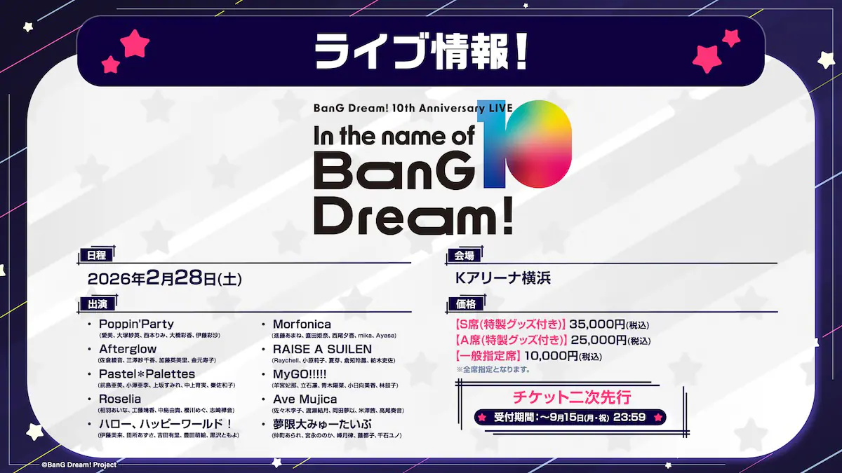 2026年2月にKアリーナ横浜で開催される「BanG Dream! 10th Anniversary LIVE」のライブタイトル、および追加出演者が公開された。公演名は「BanG Dream! 10th Anniversary LIVE『In the name of BanG Dream!』」。追加出演者として、Afterglowの三澤紗千香、加藤英美里、金元寿子、Pastel*Palettesの小澤亜李、上坂すみれ、中上育実、秦佐和子、ハロー、ハッピーワールド!の田所あずさ、吉田有里、豊田萌絵、黒沢ともよの追加出演が発表された。