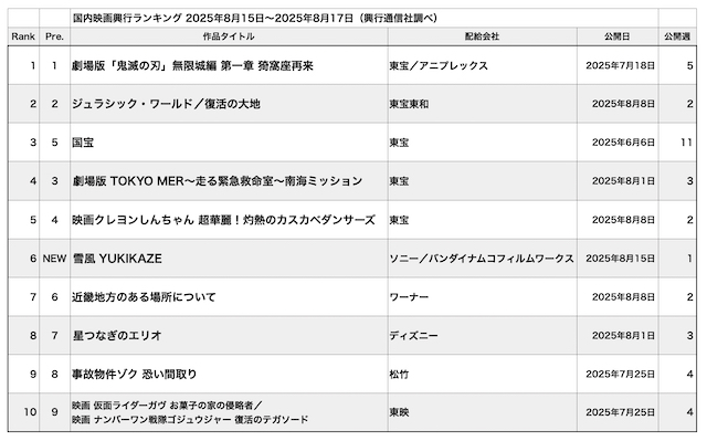 日本の夏、シネコンの夏。景気のいい記録更新が揃い踏みとなった。8月第3週の動員ランキング、5週連続の1位は『劇場版「鬼滅の刃」無限城編 第一章 猗窩座再来』。週末3日間の動員121万8000人、興収は18億7500万円。8月17日までの31日間の累計動員は1827万2900人、累計興収は257億8300万円。公開からたった1ヶ月で、『君の名は。』(2016年公開、251.7億円)や『アナと雪の女王』(2014年公開、255.0億円)の記録を上回って、歴代興収4位のポジションにつけた。今後、大失速しない限り3位の『タイタニック』(1997年公開、277.7億円)、2位の『千と千尋の神隠し』(2001年公開、316.8億円)を抜くのも時間の問題。焦点は、果たして『劇場版「鬼滅の刃」無限列車編』(2020年公開、407.5億円)超えがあり得るのかというシリーズ内対決に絞られてきた。