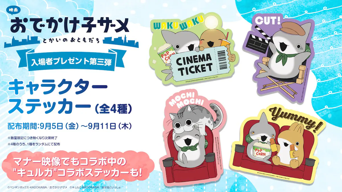 入場者プレゼント第3弾は、映画本編前に上映中の『夜は猫といっしょ』コラボの“上映マナーこうざ”のキャラクターステッカー(全4種)。子ザメちゃん、あんこうちゃん、うさめちゃんはもちろん、『夜は猫といっしょ』よりキュルガがデザインされた、劇場でしかゲットできないステッカーとなっている。