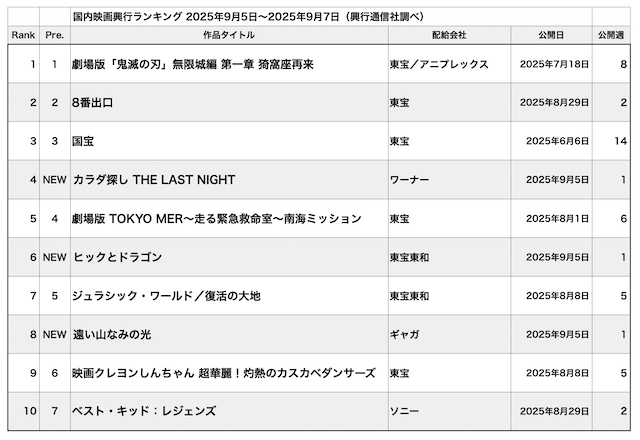 9月第1週の動員ランキングは、『劇場版「鬼滅の刃」無限城編 第一章 猗窩座再来』が週末3日間で動員50万1000人、興収8億400万円をあげて8週連続1位。9月7日までの公開から52日間の累計動員は2200万7400人、累計興収は314億2600万円となっている。続く2位の『8番出口』、3位の『国宝』も前週と変わらず。先週末は期待の新作の公開が重なったが、東宝配給による不動のトップ3を脅かすことはなかった。