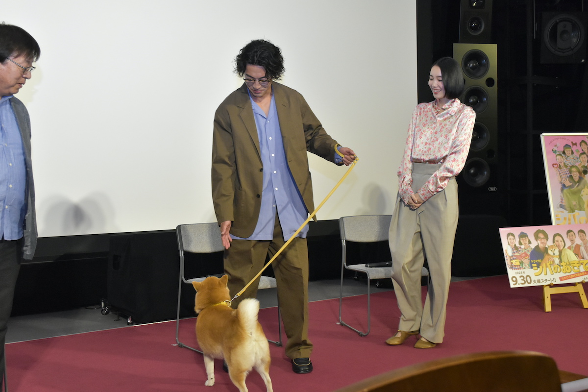 キャストと共にのこが登場すると、会場の空気は一瞬で穏やかに。大東は「うちの看板犬・福助こと“のこちゃん”に癒されてください」と笑顔を見せ、飯豊は「私は犬が大好きなので、『ワンちゃんの作品に関われるなら是非』と二つ返事で」とオファー時の心境を明かした。