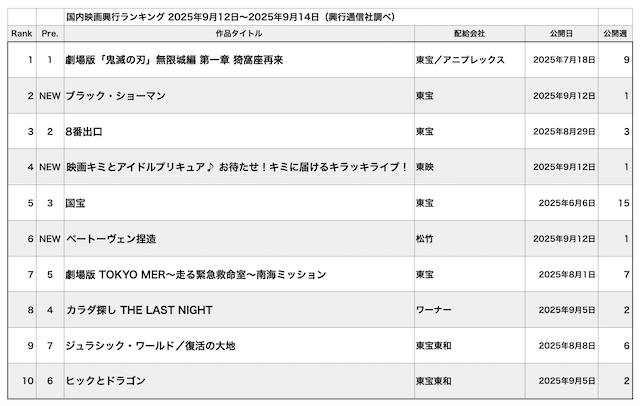 3連休と重なった9月第2週の動員ランキングは、『劇場版「鬼滅の刃」無限城編 第一章 猗窩座再来』が週末3日間で動員52万3000人、興収8億3000万円をあげて9週連続1位。祝日の9月15日までの公開から60日間の累計動員は2304万2700人、累計興収330億5600万円。2020年に『劇場版「鬼滅の刃」無限列車編』が公開されるまで約20年にわたって歴代国内興収トップに君臨していた『千と千尋の神隠し』の記録316.8億円を上回って、これで『鬼滅の刃』が歴代国内興収のトップ2を独占することに。また、先週末公開された北米をはじめ世界各国でランキング1位を独走していて、国内はともかく、世界興収では『劇場版「鬼滅の刃」無限列車編』を超えるのも時間の問題となっている。