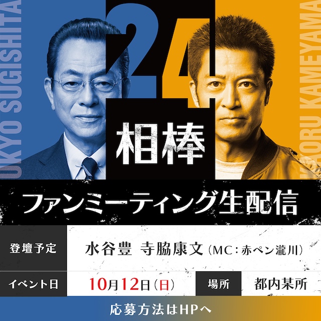 さらに、『相棒season24』のスタートを記念して、杉下右京と亀山薫が初めて「『相棒 season24』ファンミーティング生配信」を開催することが決定。映画の舞台挨拶や『相棒コンサート』などで2人が壇上に立つことはあったが、「ファンミーティング」という形でファンと交流するのは、25年の歴史の中でも初となる。現在、イベント参加者を募集中。詳細は『相棒』公式サイトにて。