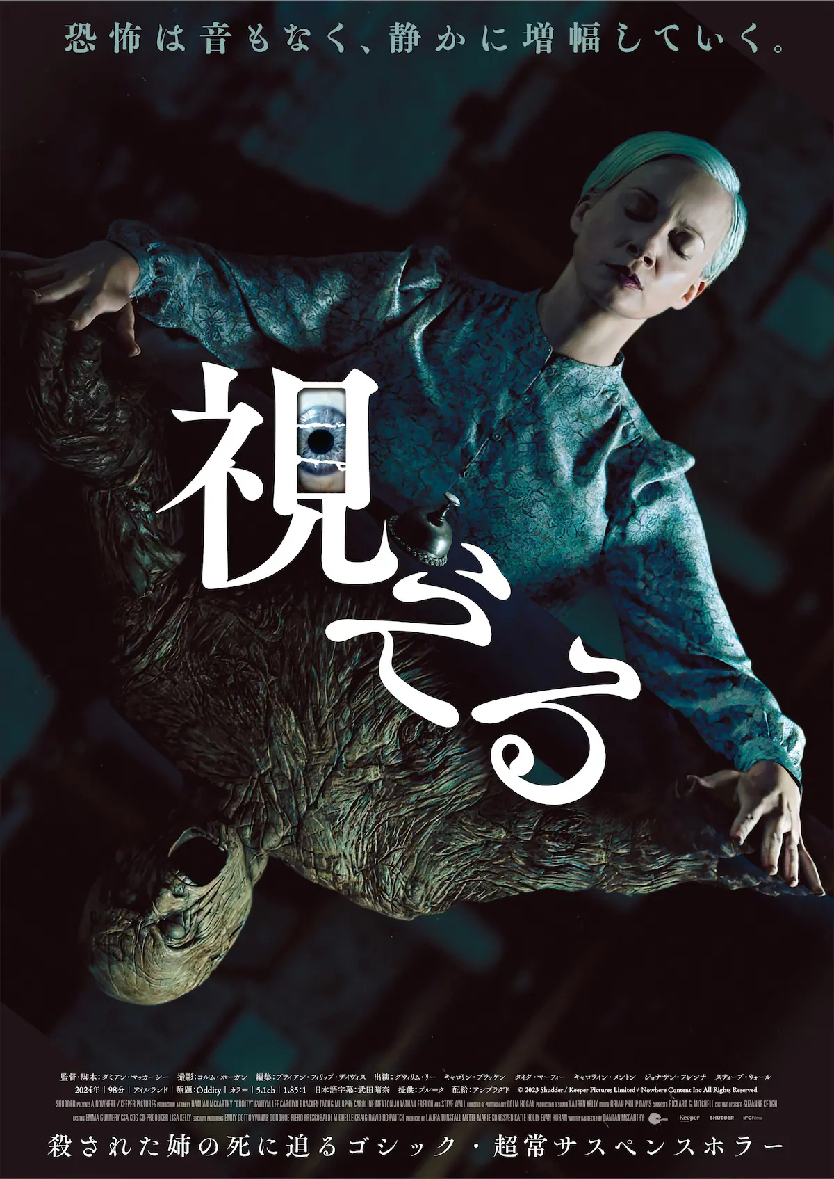 公開されたポスタービジュアルには、盲目の霊能力者・ダーシーと、不気味な木製マネキンが対になり、不穏な闇の中に浮かび上がる姿が切り取られている。大きく配された邦題の『視える』という文字には、人間の眼が重ねられ、「恐怖は音もなく、静かに増幅していく」というキャッチコピーが添えられている。