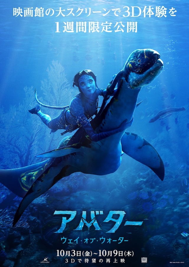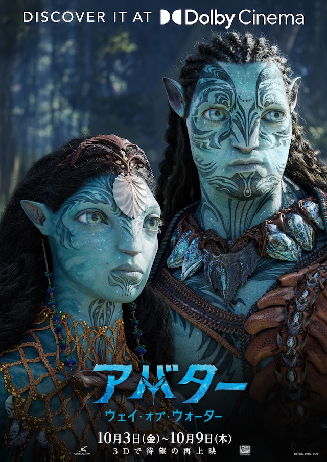 シリーズ2作目となる『アバター:ウェイ・オブ・ウォーター』はIMAX 3D字幕/ドルビーシネマ 3D字幕/4D(3D 字幕/3D 吹替)、通常版(3D字幕/3D吹替)の全6形式で再上映を予定しており、これにあわせ、ラージフォーマットのポスタービジュアルら4種も用意されている。ポスターには、主人公ジェイクの養女キリが美しき海洋生物と共に海中を進む様子をはじめ、海の部族メトカイナ族や、彼らと共に生きる海の動物“トゥルクン”、そして海の上を凛々しく突き進むジェイクとネイティリの姿があり、未知なる海の文化や美しい生命たちとの間で深まる絆を感じさせ、雄大な自然を舞台にした『アバター:ウェイ・オブ・ウォーター』を象徴するようなビジュアルとなっている。