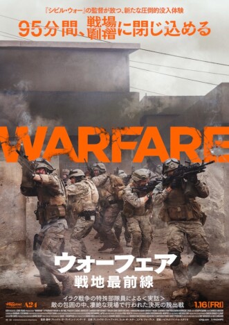 アレックス・ガーランドとレイ・メンドーサが共同監督を務めたA24製作映画『Warfare(原題)』が、『ウォーフェア 戦地最前線』の邦題で2026年1月16日に公開されることが決定した。