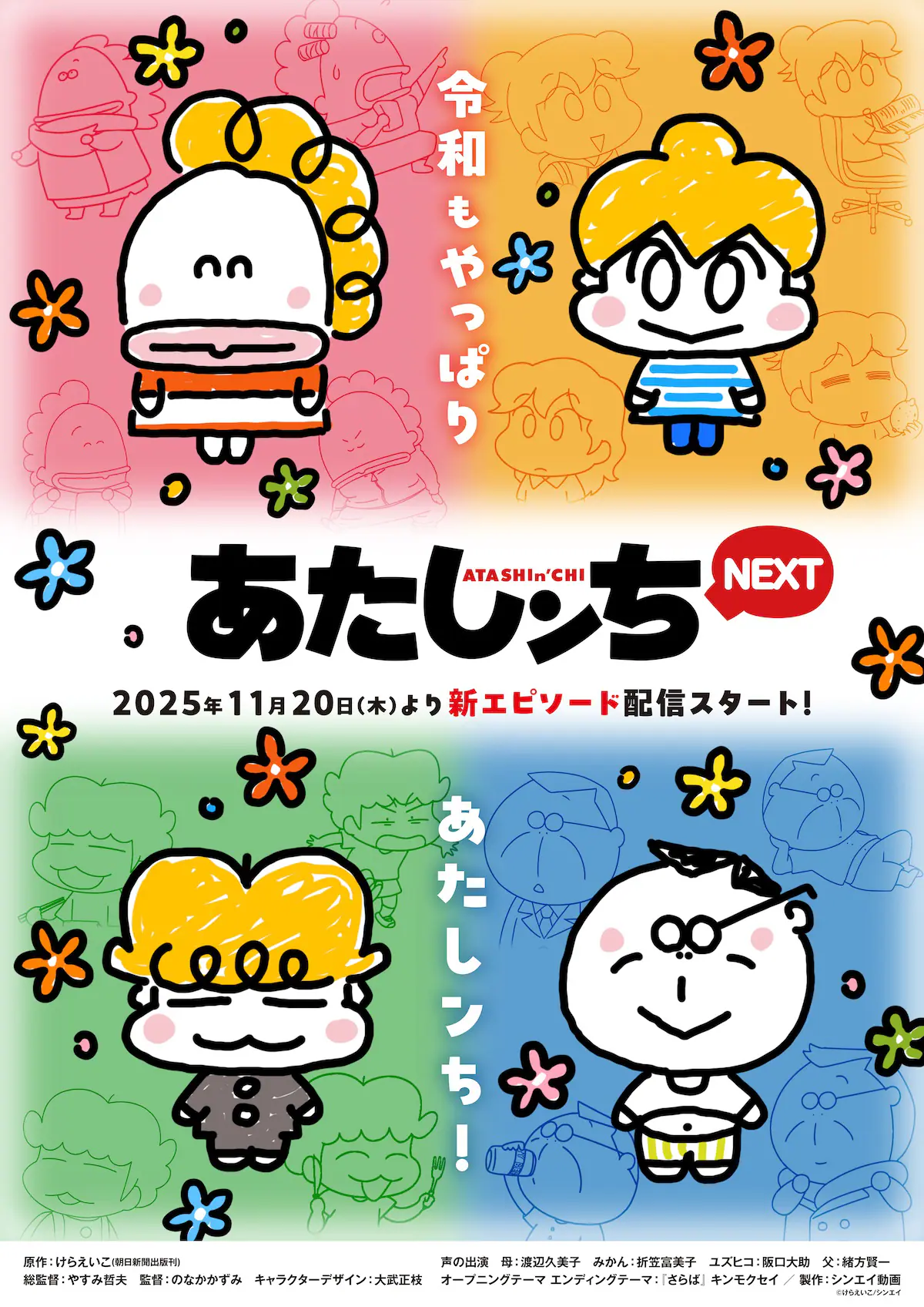 11月20日からは、『あたしンちNEXT』の新エピソードが毎月20日18時30分に5カ月連続で公式YouTubeチャンネルを中心に配信される。新作エピソードのタイトルは、11月20日配信の第6話「ユズひとりでメロン」(『あたしンちベスト』第7巻/赤肉メロン)、12月20日配信の第7話「父母バタバタ1泊旅行」(『あたしンちベスト』第10巻/固形燃料)、2026年1月20日配信の第8話「夢の中のトイレ」(『あたしンちベスト』第10巻/夢のトイレ)、2026年2月20日配信の第9話「川島さみしい夏休み」(『あたしンちベスト』第10巻/夏休みに悔いなし)、2026年3月20日配信の第10話「岩木くんと映画に行きたい」(『あたしンちベスト』第2巻/これから映画)となっており、いずれもアニメ化は初となる。