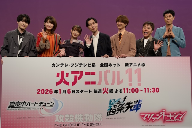 カンテレ・フジテレビ系の新アニメ枠「火アニバル!!」の作品ラインナップ発表会見が10月23日に都内で開催された。2026年1月からスタートする火曜23時枠の作品が発表された本会見では、声優の安田陸矢、瀬戸桃子、大久保瑠美をはじめ、応援ゲストとしてハライチの岩井勇気、Kis-My-Ft2の宮田俊哉、井上裕介が登壇。放送予定のそれぞれの作品の魅力を語った。