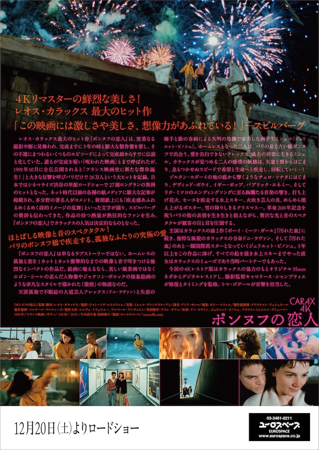 12月20日よりユーロスペースほかにて劇場公開される『ポンヌフの恋人』4Kリマスター版のポスタービジュアルと予告編、場面写真が公開された。