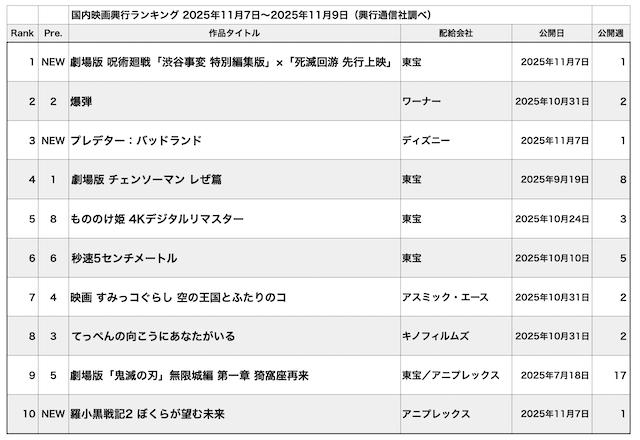 11月第2週の動員ランキングは、芥見下々による人気コミック『呪術廻戦』のTVアニメ第2期後半及び、来年1月から放送となる第3期1話&2話を上映する『劇場版 呪術廻戦「渋谷事変 特別編集版」×「死滅回游 先行上映」』が、オープニング3日間で動員41万7700人、興収6億4000万円をあげて初登場1位に。これで東宝配給作品が21週連続で1位、そして『劇場版「鬼滅の刃」無限城編 第一章 猗窩座再来』、劇場版『チェンソーマン レゼ篇』に続いて『週刊少年ジャンプ』発IPのアニメーション作品が17週連続で1位となった。今週末公開作品にもそこまで強い作品はないので、いずれの記録もまだまだ更新されていく可能性が高い(来場者プレゼントの人気次第では劇場版『チェンソーマン レゼ篇』の返り咲きもあり得るだろう)。