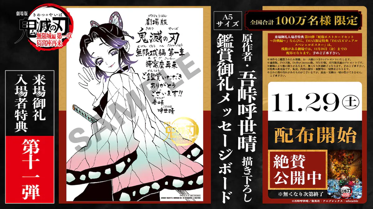 入場者特典第11弾は「原作者・吾峠呼世晴 描き下ろし鑑賞御礼メッセージボード」。原作者の吾峠が描き下ろした胡蝶しのぶのイラストとともに、来場者への感謝を綴ったA5サイズのメッセージボードが、11月29日より配布される。