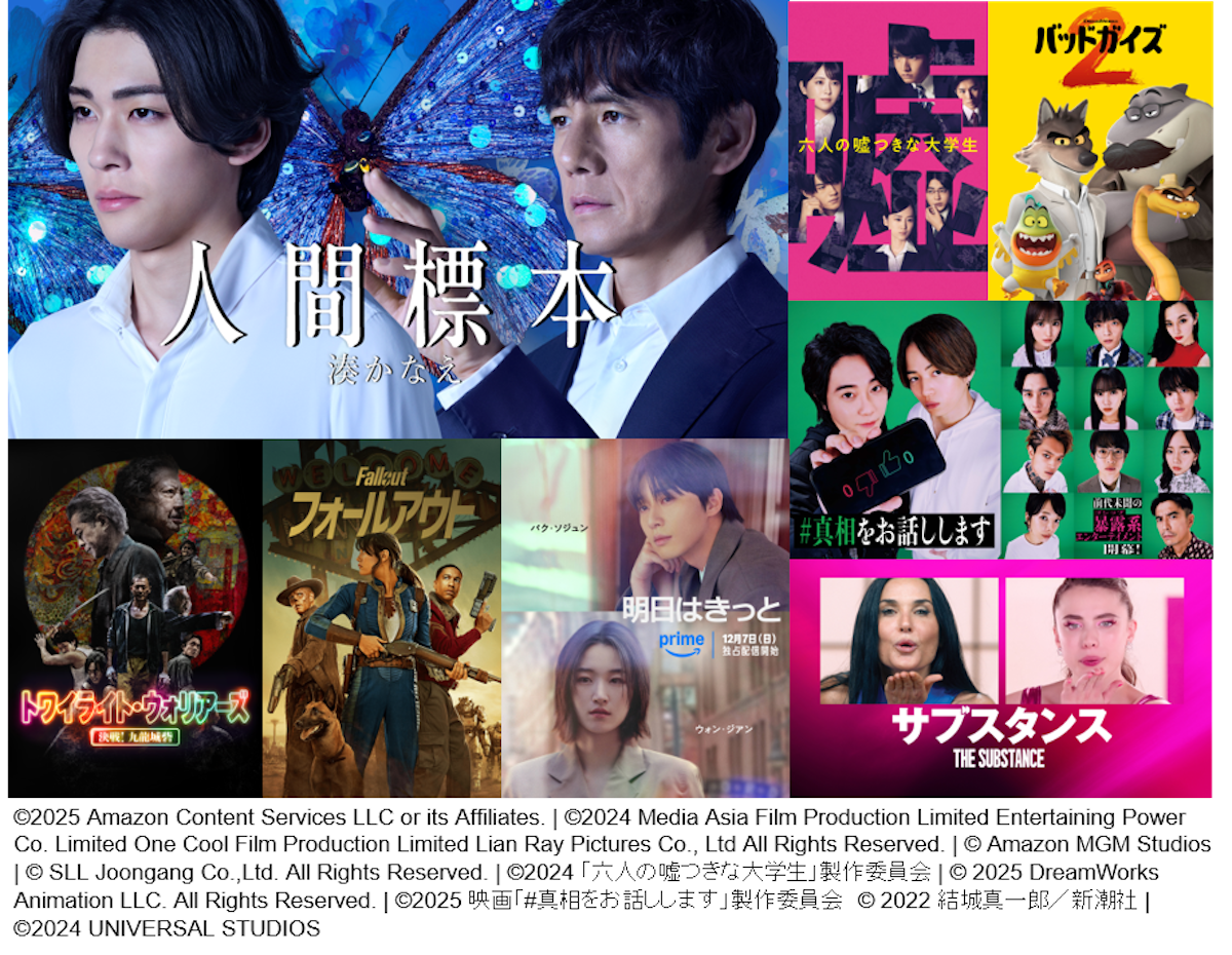 映画やテレビ番組が見放題のPrime VideoのSVODサービス。映画では、大森元貴(Mrs. GREEN APPLE)と菊池風磨(timelesz)がW主演を務めたミステリー映画『#真相をお話しします』、浅倉秋成による同名ベストセラー小説を映画化した『六人の嘘つきな大学生』、香港映画界のレジェンドが集結した『トワイライト・ウォリアーズ 決戦!九龍城砦』、デミ・ムーア主演『サブスタンス』などがラインナップされた。