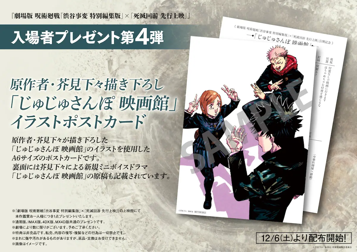 『劇場版 呪術廻戦「渋谷事変 特別編集版」×「死滅回游 先行上映」』の入場者プレゼント第4弾として、原作者の芥見下々描き下ろしのイラストポストカードが配布されることが発表された。