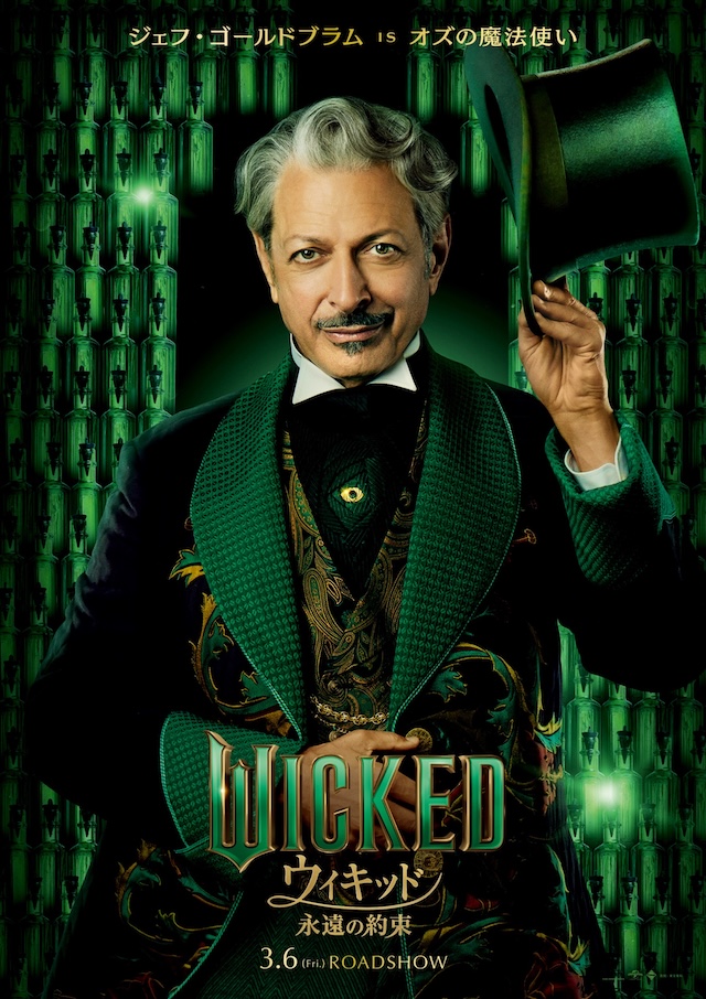 シルクハットを手に不敵な笑みをみせるのが、オズの国で最も偉大で恐ろしい存在である“オズの魔法使い”(ジェフ・ゴールドブラム)。自分が築き上げた世界が、実はまやかしであることをエルファバに気づかれた彼は、彼女を捉えようと躍起になる。
