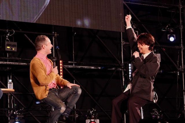 ステージには、ウッド演じるフロドの吹き替え声優を務める浪川大輔もサプライズ登場。浪川が25年前からウッドの吹き替え声優を務めていることを伝えると、ウッドは驚きつつ深いお辞儀をしながら浪川と握手。さらに『グーニーズ』でアスティンが演じたマイキーの吹き替え声優を務めたことを浪川が明かすと、アスティンは浪川とハグをして“初対面”を喜んだ。